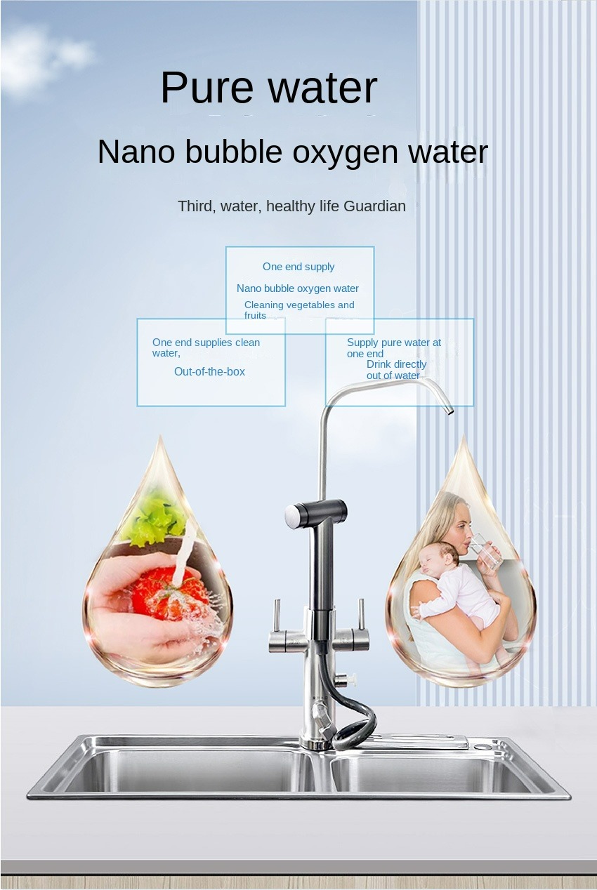 1. Three water outlet functions: providing purified water, pure water, and nano bubble activated oxygen water, suitable for different usage scenarios.