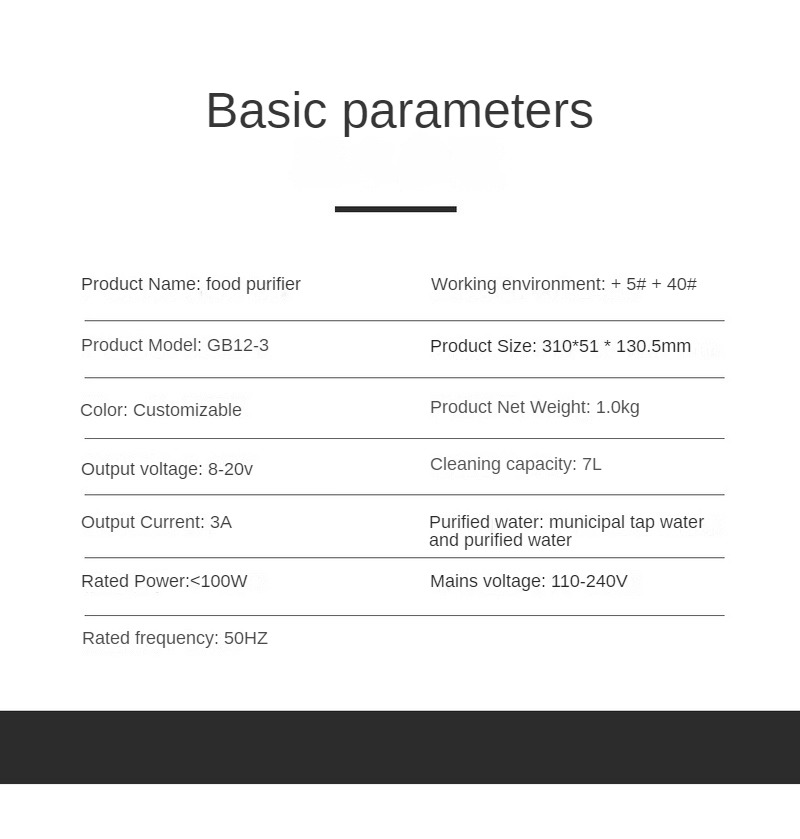 DGB12-3 food purifier is an innovative household appliance designed to provide users with an efficient and safe food cleaning solution. It adopts ion reaction electrolysis technology without any additives, forming hydroxide ions (OH -) and hydrogen ions (H+) through electrolysis, purifying various residual hormones and bacteria. The product adopts a dual compartment split design, which not only improves purification efficiency but also avoids cross contamination between ingredients.