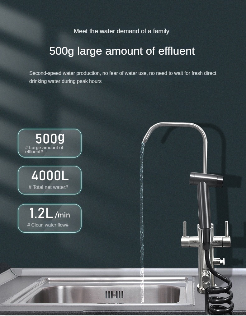 The CQ4-4 water purifier adopts a 3-level reverse osmosis precision filtration system, which can deeply purify water quality. The core filtration accuracy is as high as 0.0001 microns, effectively removing impurities, heavy metals, organic matter, and other harmful substances from water. This device has a large water output of 500 gallons and provides a fast water production rate of 1.3 liters per minute, ensuring that water can be produced quickly even during peak usage periods, meeting household water needs. The product is equipped with real-time water quality monitoring and core replacement reminder functions, allowing users to understand the water quality status at any time and replace the filter element in a timely manner.